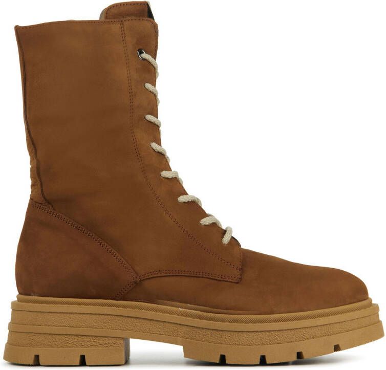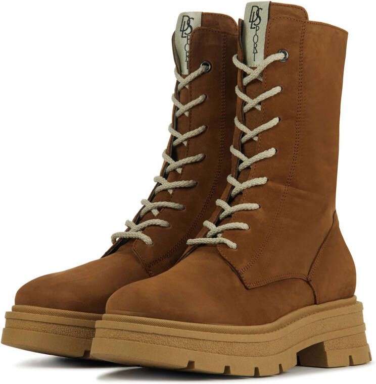 Damesschoen model 5510 in de kleur cognac van DL Sport Pasvorm Dit model van DL Sport valt normaal op maat Beschrijving Enkellaars met hak voor dames van het merk DL Sport. Deze veterlaars is uitgevoerd in cognackleurig suède. De binnenzijde van de schacht bevat een rits om het aan- en uittrekken te versoepelen. De binnenkant is uitgevoerd in leer en een stevig contrefort draagt bij aan het loopgemak. De rubberen zool heeft een grof profiel voor stevige grip.