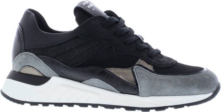 Sneakers voor dames2507-11.03van het merk Piedi Nudi. Deze H-fit sneaks hebben een upper van leer, suède en stof in zwart, lichtgrijs en goud. De binnenkant is in leer met een uitneembaar voetbed uitgevoerd. Branding is zichtbaar op de tong en de hiel. Zwarte veters en een zwarte lakleren afwerking geven de shoes een extra coole look. De witte/zwarte rubberen zool beschikt aan de achterzijde over een bijpassende stabilizer. Kleur: zwart. (Black).
