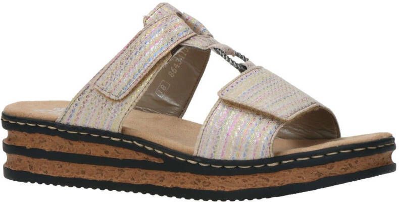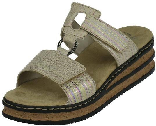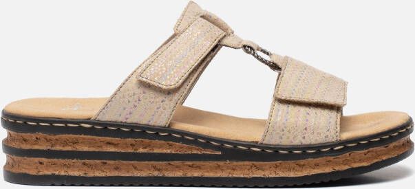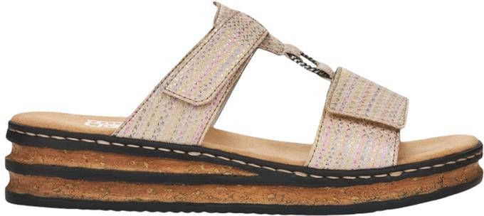 Rieker dames slipper. Deze slipper van Rieker heeft een moderne plateauzool met een dubbele klittenbandsluiting zodat de schoenen altijd goed passen. De hakhoogte van de schoen is 1,5 cm. De kleur van de slipper is beige met een subtiele multicolour print. Het materiaal is synthetisch leer en de voering is van zacht materiaal.